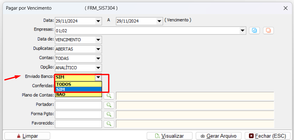 Para que as duplicatas da Remessa sejam identificadas selecione na opção Enviado ao banco como SIM ou TODOS