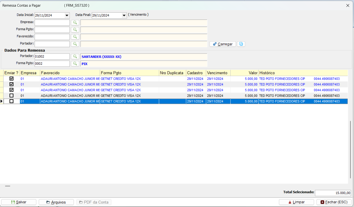 Diferente do receber que gera um registro para o banco e existe o retorno, a remessa do a pagar é somente a seleção das duplicatas no período de vencimento para visualização no relatório de vencimento a pagar.
