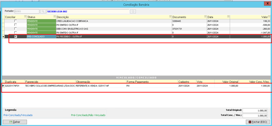 Pré conciliadas: O sistema automaticamente vincula valores que são iguais. Verificar se realmente bate descrição, valor, favorecido.