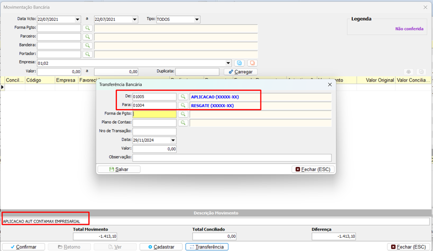 Obs.: Cadastrar portadores da conta, e planos de contas de transferência entre contas ou resgate e aplicação especificamente.
