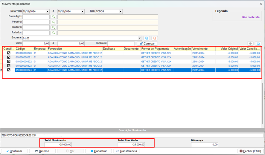 Importante: Quando selecionado uma duplicata com valor diferente, o sistema irá apresentar a diferença e não deixará concluir até ser selecionado todas os registros correspondentes com o valor, que pode ser um montante ou não, em casos de valor errado, verificar e corrigir.