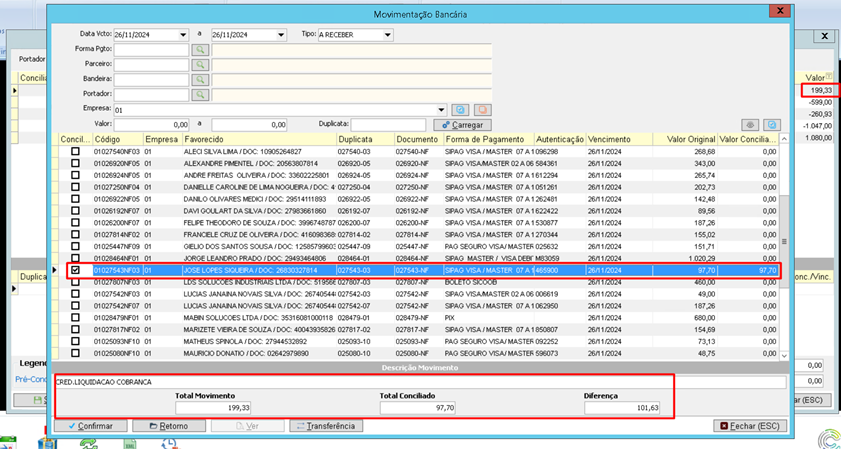 Selecionar o registro a ser conciliado com duplo clique. Filtrar conforme necessário a duplicata e selecionar com enter.