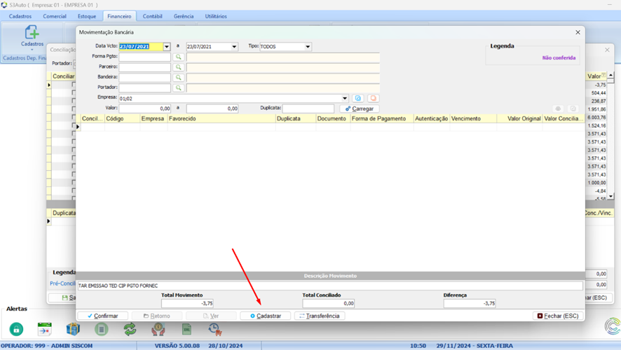 Clique em cadastrar dentro da tela de conciliação.